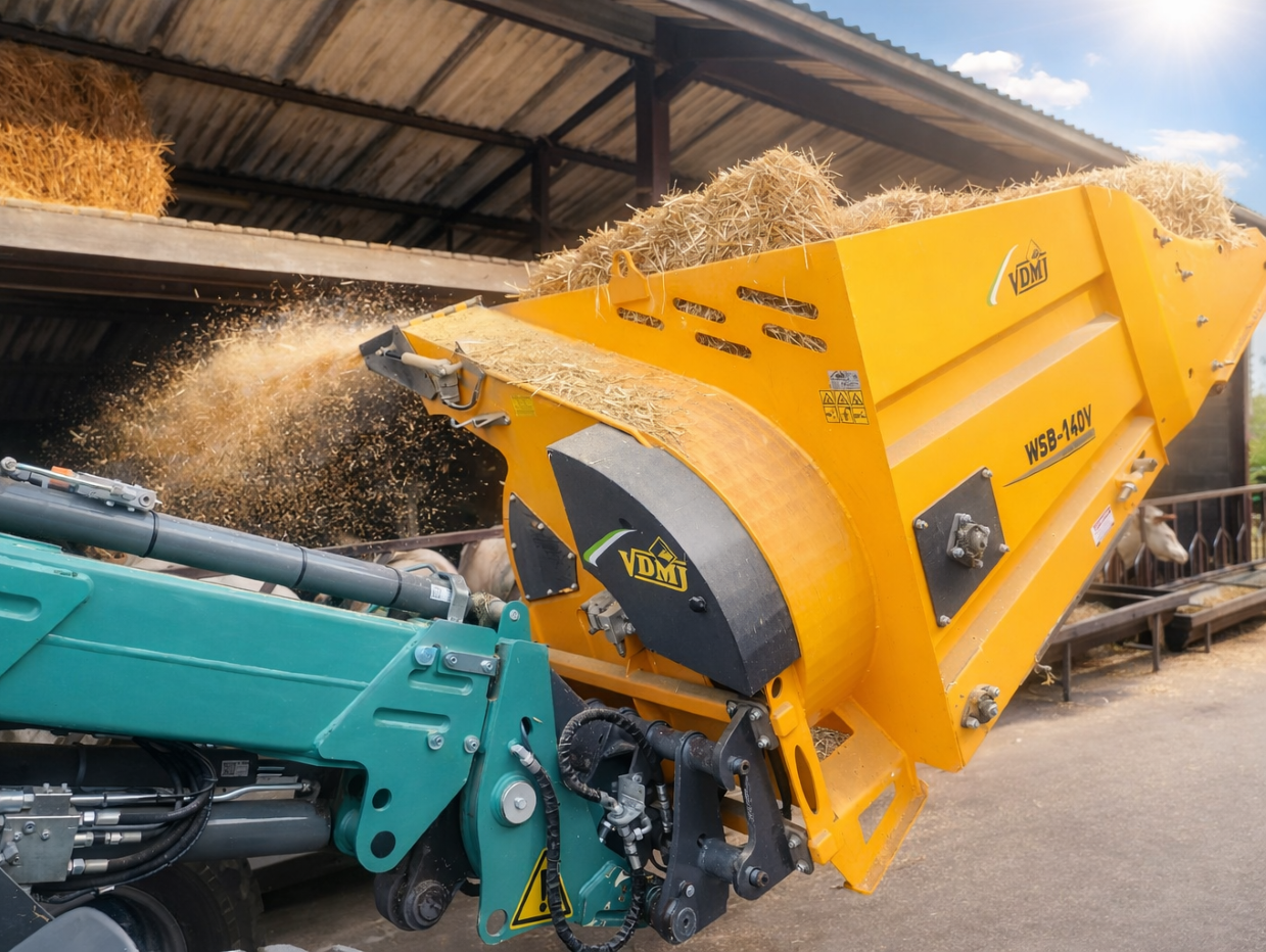 La WSB-140V est une mini pailleuse pesant 680 kg. Elle a été spécialement conçue pour les petites chargeurs articulés à partir de 1700 kg de poids propre et avec un débit d’huile minimum de 35 l/min. La pailleuse peut traiter des balles rondes et carrées. La WSB-140V a une longueur de chargement de 1,40 m et est équipée en standard d’une goulotte fixe sur le côté gauche. Grâce à cette goulotte, vous pouvez paille à courte distance mais aussi à longue distance (10-12 m en fonction du débit d’huile). La machine est équipée d’un tapis rotatif qui permet de contrôler la quantité de paille acheminée vers la turbine. La commande complète de la pailleuse s’effectue par un boîtier joystick situé dans la cabine.